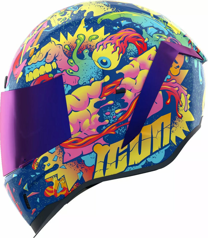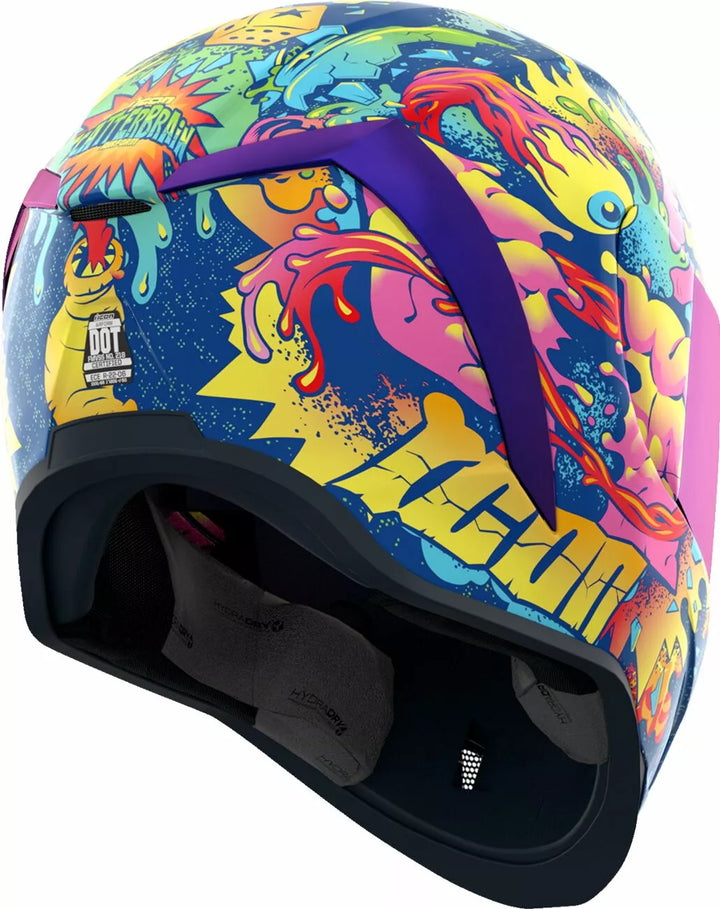 Injektionsstøbt polycarbonatskal til styrke, intern luftstrømgeometri, kontinuerligt udluftningssystem, sculpeed halsrulle, fagfrit ikonoptik ™ skjold med Rapid-Reale ™ -system, ProCk ™ Positive Shield ™ Skrivningssystem, INTERN DROP High Visor skal kun bruges, mens hovedfladen er i den fuldt lukkede position, fjernelse af MITLEFT DEFLEKTOR, FREADABLEAGLE HYDRADRY ™ Fugtvejr foring, interne højttalerlommer fungerer med Icon's R.A.U. Bluetooth -enhed, inkluderer Dark Smoke Dropshield, inkluderer Clear & Rst Purple Optics Shield ™