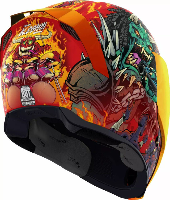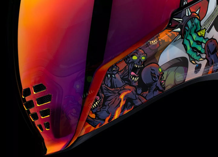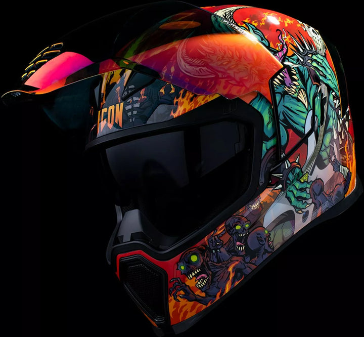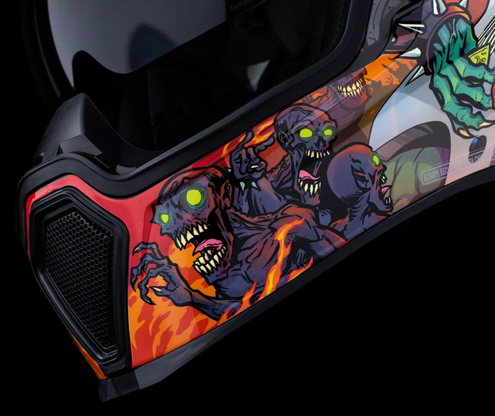 Fjernelig støbt åndedrætsafbøjning og hakegardin, injektionsstøbt polycarbonatskal til styrke, fagfri dropshield ™ med udvendig switch, forsænket tvillingkanalsuvestkølingssystem, flere overdimensionerede indsugningsporte sideplader, Dropshield ™ visoren skal kun bruges, mens hovedfladen er i den helt lukkede position, fjernelse af FREAK HYDRADRY ™ Moisture Wicker, Gl, GLOW i det mørke i det mørke, internalmøde, internalmøde, internalmøde, internalløn Lommer arbejder med Icon's R.A.U. Bluetooth-enhed, inkluderer Clear & Rst Sunset Fog-Free Fliteshield