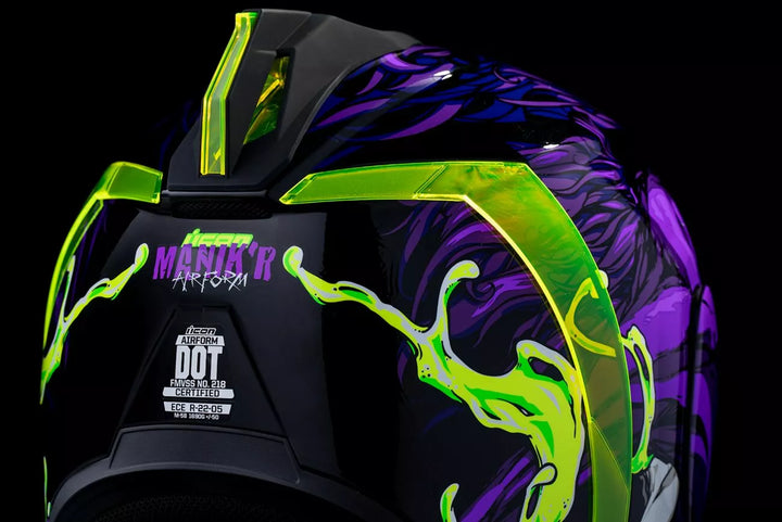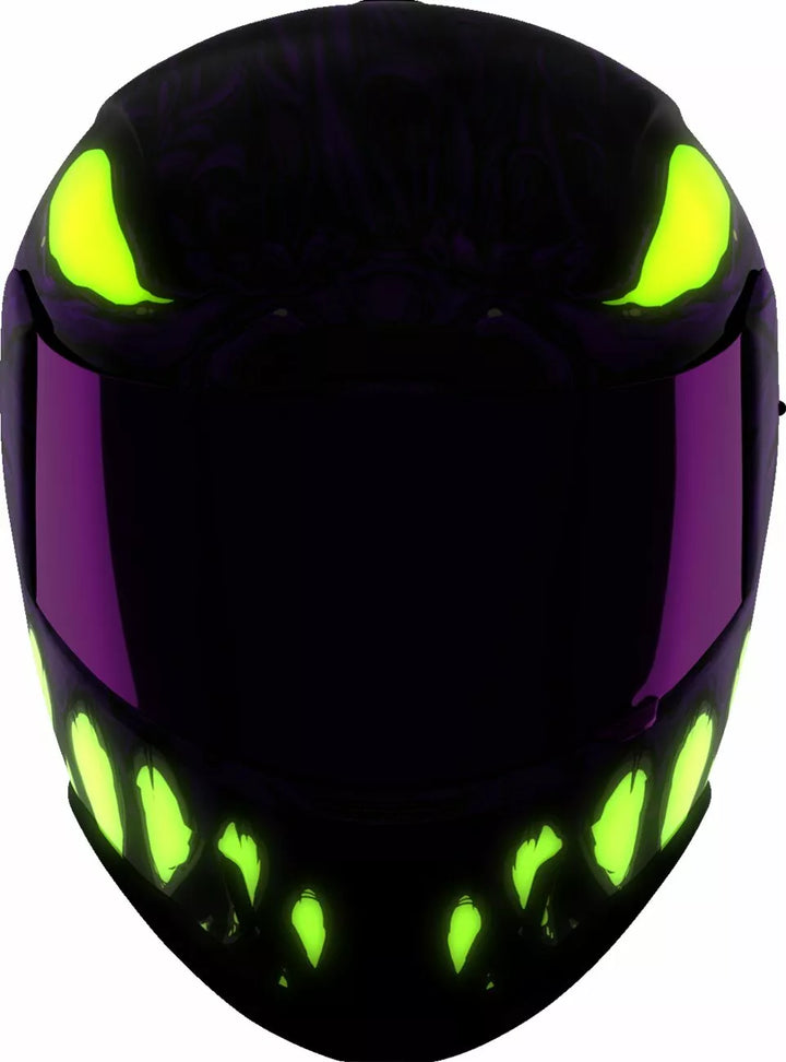 Kontinuerligt udluftningssystem, fagfrit ikonoptik ™ skjold med Rapid-Release ™ -system, injektionsstøbt polycarbonatskal til styrke, intern luftstrømgeometri, skulptureret halsrulle, Prolock ™ Switch, den udvendige med låseskivende swequ Visor, skal kun bruges, mens hovedfladen er i den fuldt lukkede position, fjernelse af den fjernede pusten, fjernelse af Living. 3-delt fugtvæberforing, interne højttalerlommer fungerer med Icon's R.A.U. Bluetooth -enhed, inkluderer Dark Smoke Dropshield ™ og Rubatone Black Speedfin ™