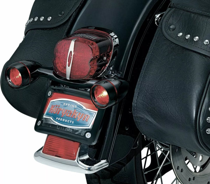 Udskift OEM -svingsignalbjælken og signaler med dette strømlinede sæt, lysbjælken flytter nummerpladen under baglygtet; Indbygget lys belyser nummerpladen, blinklys er enkeltkredsløb, funktion K�ryakyn Deep-Hish Bezels og røde linser, flad nummerplade-support inkluderet
