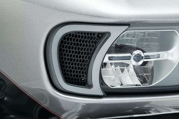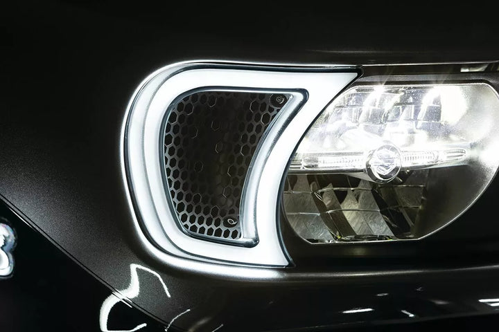 Dette ultra-trick-design giver maksimal L.E.D. Overfladeareal og output, med en slank omviklet polycarbonatlinse og ABS-grill til åben luftstrøm, dobbeltfunktionsafbrydelse af hvide løbende lys med rav-blinklys, stik og leg