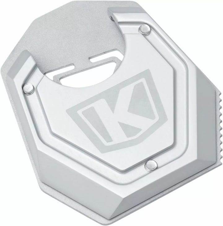Tilvejebringer yderligere overfladeareal for at forhindre kickstand fra at synke ned i bløde overflader, CNC bearbejdede 6061-T6 aluminiumstop med laserskåret rustfrit stål bundplade, den ydre kant kan kan bruges til Breide på flids på FLTR. Bundpladeannoncerne trækkraft for at hjælpe med at implementere kickstand under våde eller mudrede forhold, inkluderer tre M5 -skruer