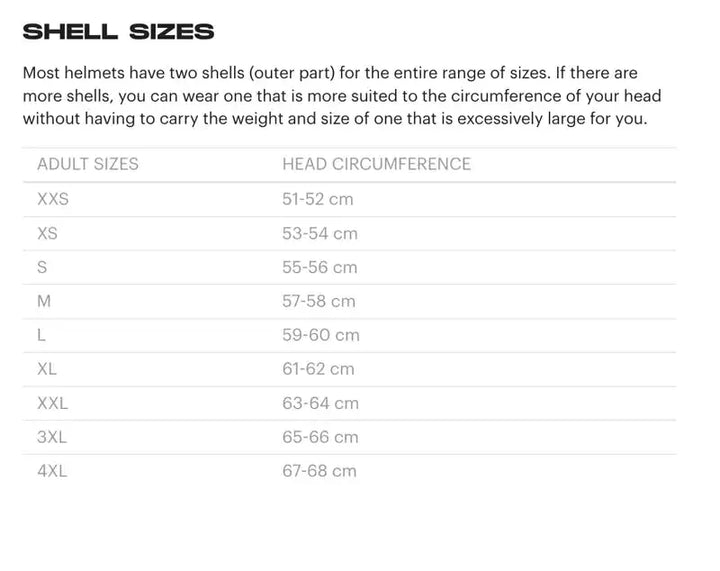 Tilgængelige størrelser: Hjelmen fås i fire skalstørrelser for at sikre en perfekt pasform: