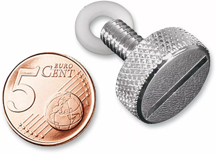 Krom i ét stykke stålkonstruktion, bred, dyb radieret slot accepterer kvart eller flad skruetrækker, hævet diamantknurl på kanten, 1/8 "længere til lettere sædeinstallation med sadelbags eller bagage stativer, inkluderer nylonvaskemaskine