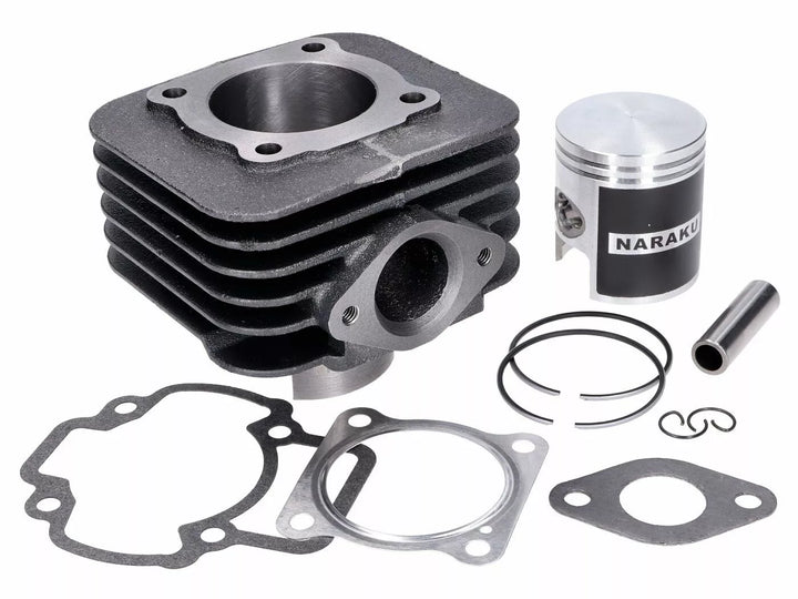 Robust Naraku Sport Cylinder Kit (Cast Iron) With 70cc for Scooter with Air-Cooled Piaggio Engine, The Naraku Piston Is Provided With A Molybdenum Coating, Which Protect the Cylinder and Piston During the run-in period, this coater cylinder is suitable for series and sports exhaust systems, if the original carburerettor remains installed, The carburerettor jetting should be INCREASED BY about 7-10% (Guideværdi) anbefales det at bruge et 17,5-19 mm sportscarburerettor, delive pakninger pakning sæt 70cc cylinderhoved anbefales (sælges separat), leveringsomfang som vist på produktfotoet