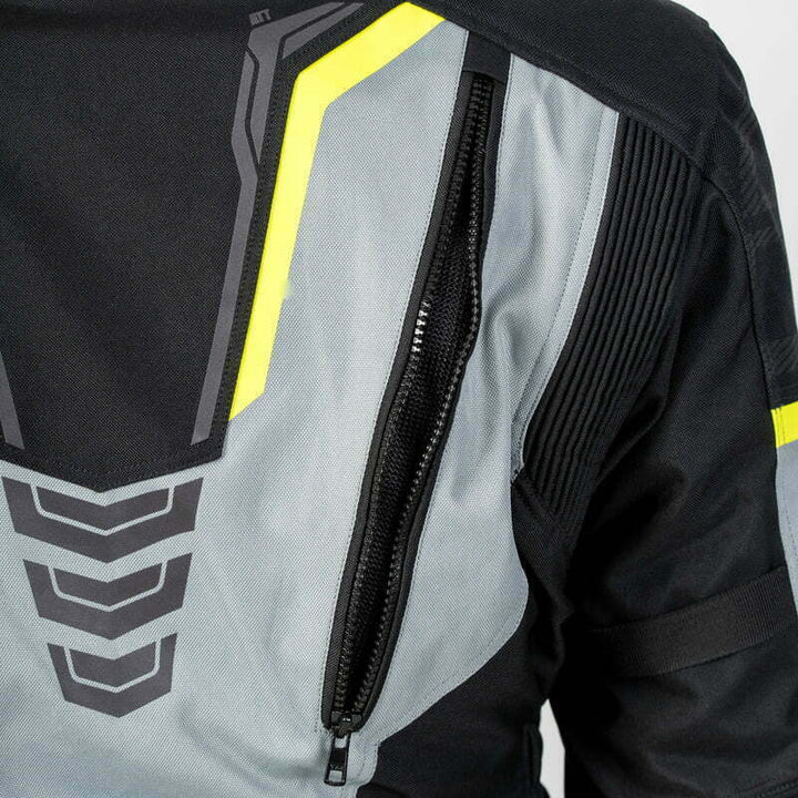 Ozone Textil Mc-Jacka Tour III i grå och fluorgul design med ventilationsdragkedjor och justerbara remmar för optimal passform och komfort.