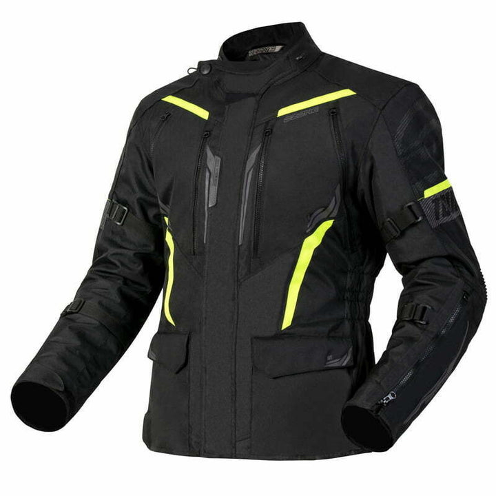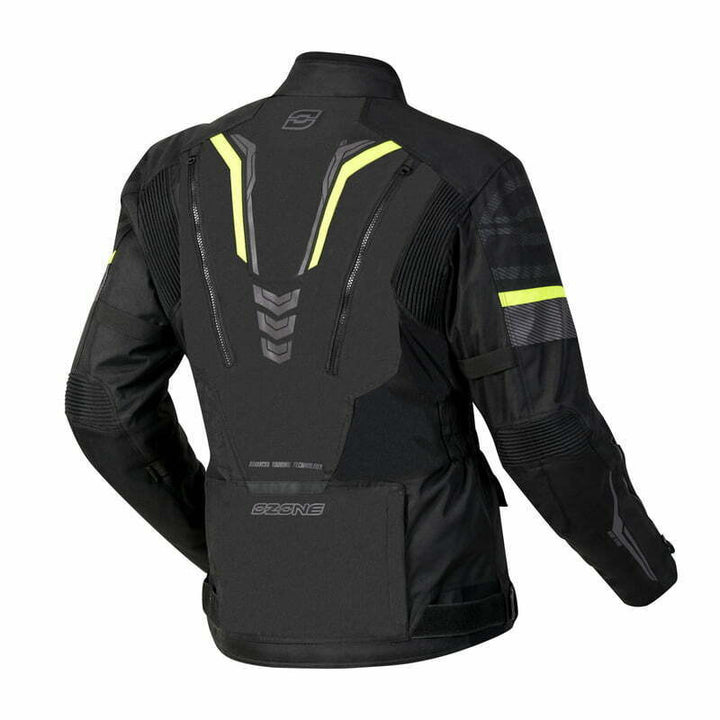 Ozone Textil Mc-Jacka Tour III i svart och fluorgul med ventilationsdragkedjor och justerbara remmar för optimal passform.