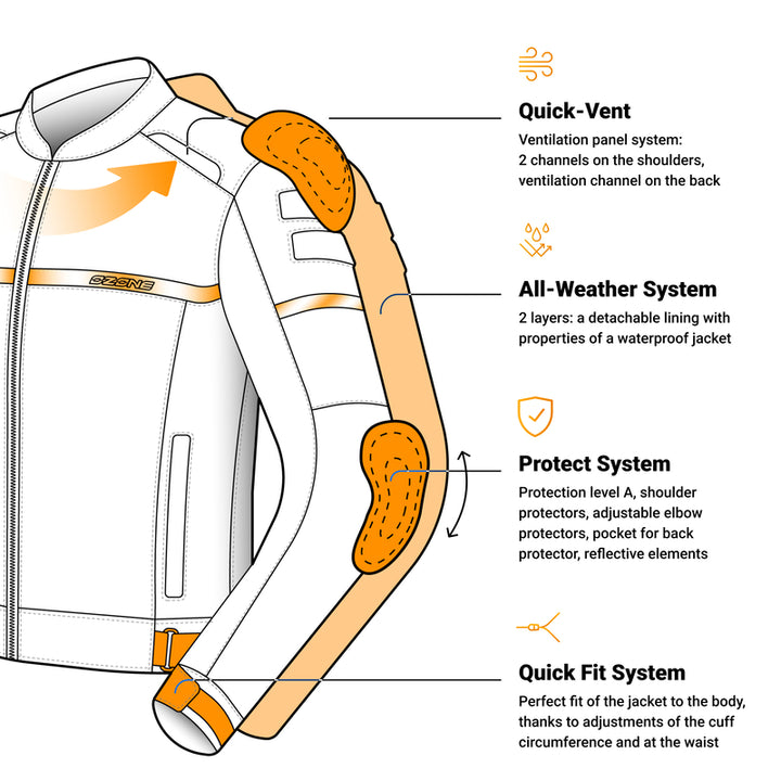 Ozon Rider er en Alsidig, behagelig og sikker MC -jakke, perfekt til bykørsel og længere ture. Med CE-certificeret beskyttelse, en vandtæt og opvarmende indre foring og effektiv ventilation, er dette en jakke, der fungerer hele året rundt. Derudover findes det i størrelser op til 13xl, hvilket gør det tilgængeligt for alle chauffører.