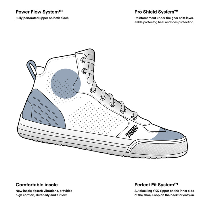 Rebelhorn Spike er smarte og funktionelle motorcykelsko, skabt til bykørsel og daglig brug. Disse sko kombinerer sikkerhed, komfort og stil og er perfekte til førere, der ønsker et casual udseende uden at gå på kompromis med beskyttelsen.