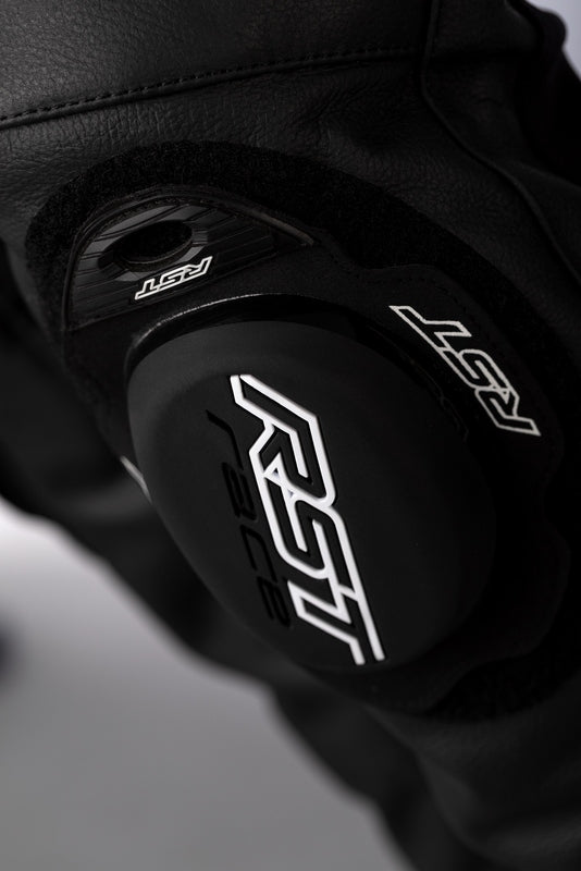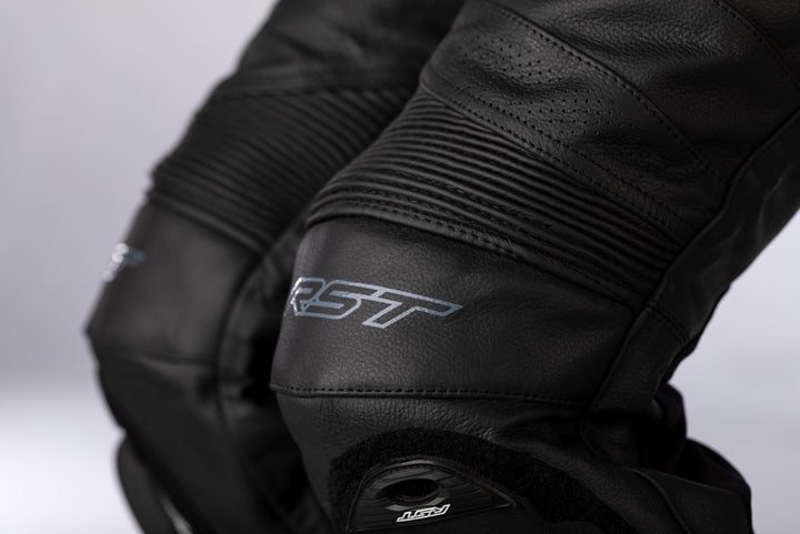 Knäskydd med RST-logotyp på RST Dam Mc-Skinnbyxor S-1 Svart, designade för extra säkerhet och skydd vid motorcykelkörning.