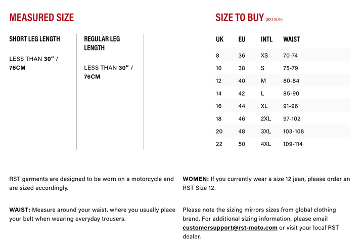 Storlekstabell för RST Dam Mc-Skinnbyxor S-1 Svart med mått för midja och benlängd. Hjälper till att välja rätt storlek för perfekt passform.