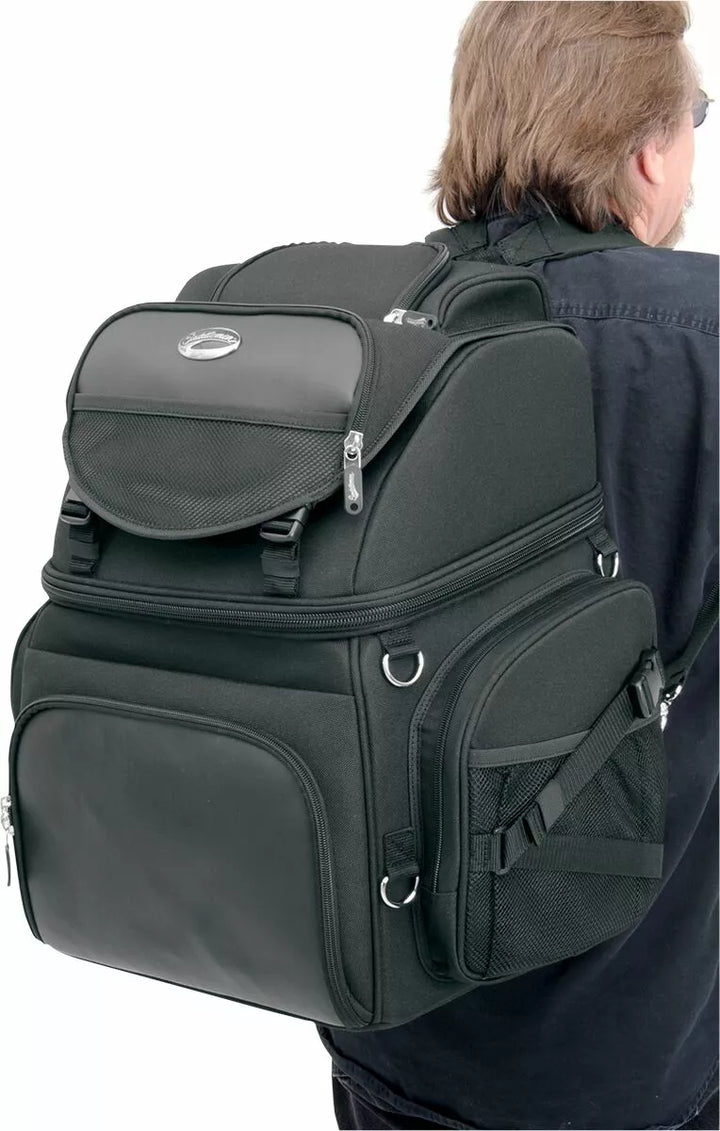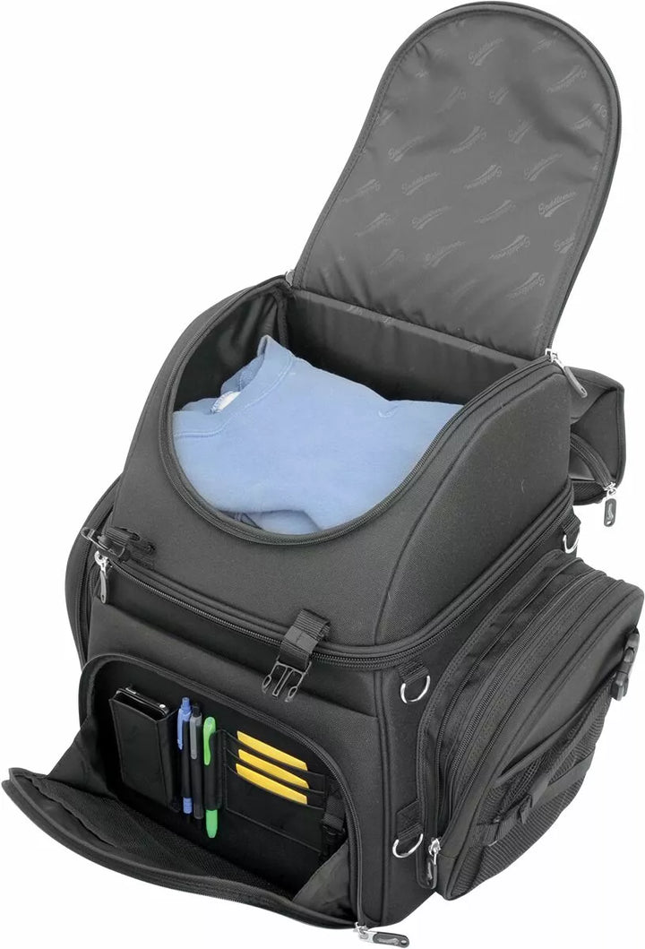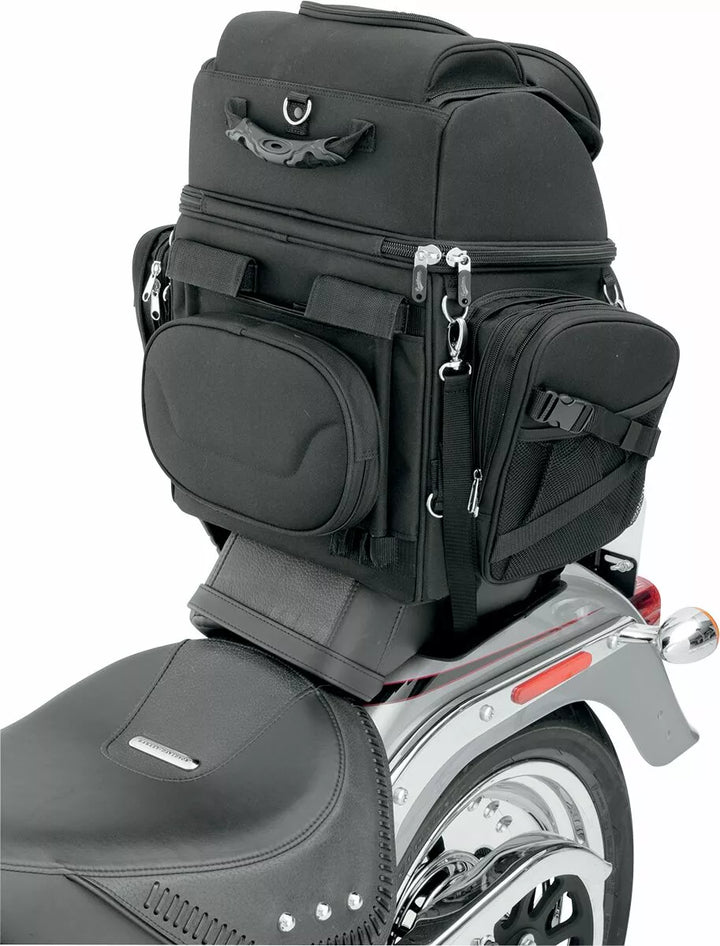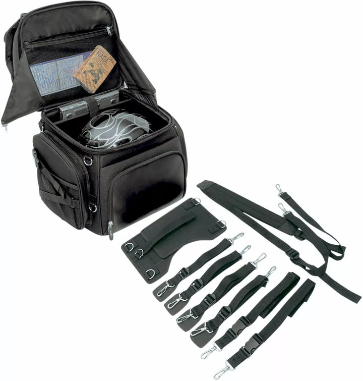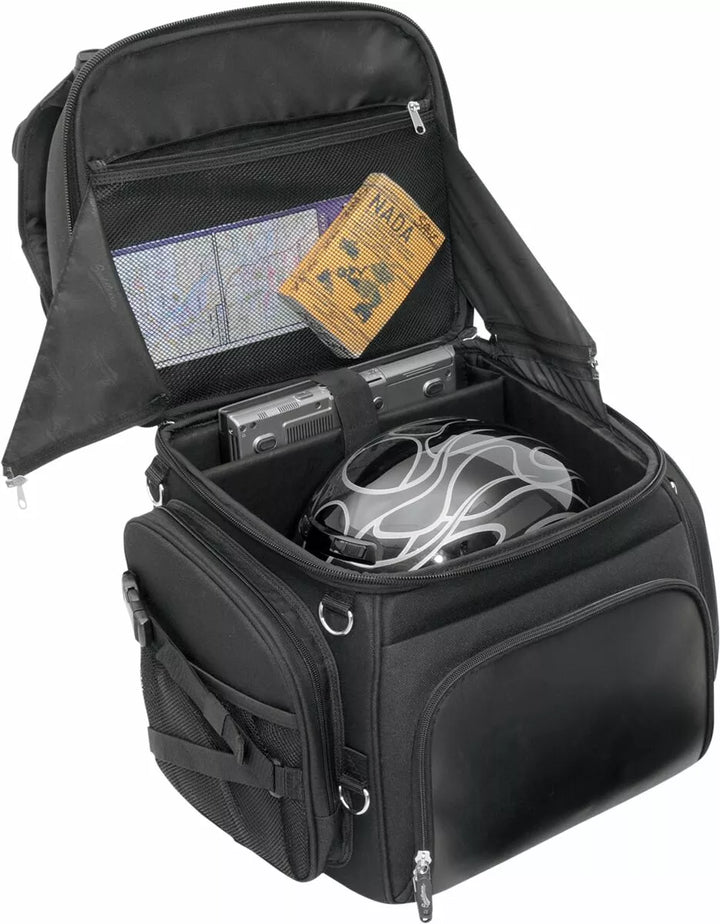 To monteringssystemer inkluderede: Saddlemen's "Versa-Mount" under-sædet åg og sele, og et justerbart sissy barremsystem, der let fastgør pose til dit motorcykels sæde, bagageholder eller sissy bar, ryglænsplade kan justeres detakelbackpack straps for let off-the-bike jaunts, inkluderer en anden stor topbelastning af hovedrummet med interne organisatorer lomme, fem uden for potten, tærbelægg Udvidet for ekstra kapacitet, fem interne og to ydre mesh-lommer Elementerne, øverste udvendige klap kan justeres til at bære en jakke, mini-padlock, med ekstra nøgler, hjælper med at sikre dine ejendele i posen, den interne struktur vedligeholder poseform og er stærk nok til at læne sig på, selv når når de er 14 "inches (55,72 l) lagtkapacitet;