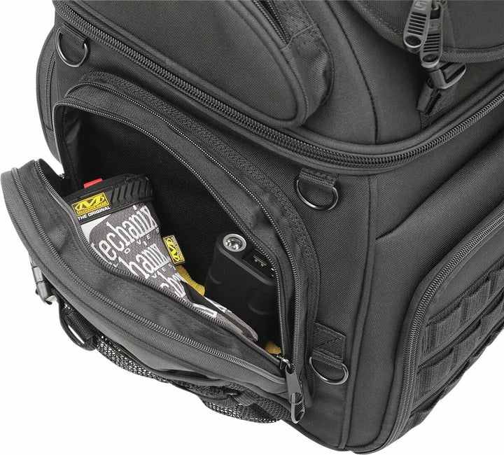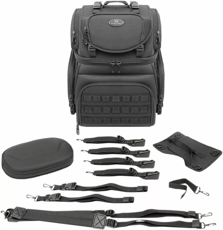 Alle remender inkluderer unikke Keepers-system, der eliminerer behovet for at skære, efter at posen er installeret, let monteret til sissy bar plus fuld montering af stroppesæt til en række monteringsmuligheder, flere tunge duty D-ring vælger til yderligere mote til opbevaringsudbytte, inkluderer bundet regn dækning for ekstra beskyttelse fra elementerne, bredt lynlås midtåbningsforsikringssikkerheds lethed, interne lynlås mesh-bøjede regn for at bevise, for ekstra beskyttelse fra elementerne, bredt lynlås center åbningssikkerhed UV-klassificeret, Weather's Shpein 1200D-chassis, de vigtigste eksterne lommer