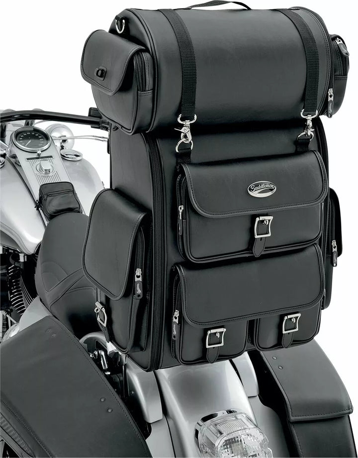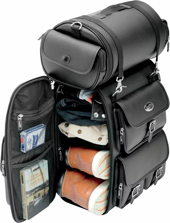 To fulde sideåbninger giver let adgang til taskeindhold, mens tasken stadig er monteret på cykel, fuldt justerbart sissy barmonteringssystem foregår på få sekunder over enhver størrelse og stil sissy bar pude; Når du er justeret for din størrelsespude, behøver du aldrig at justere den igen, stiv konstruktion giver rytterstøtte og kan lænes tilbage på, når de er monteret på bagsædet, flere udvendige lommer, intern justerbar hylde, regncover blad, konstrueret, konstrueret af inkluderet til ekstra lastkapacitet, dimensioner: Sissy bar taske 15 "W X 18" H X 8 "D med rullepose 14" W X 8 ᄑ "H X 8