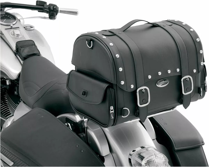 Slank-stil halepose med stropper, studs og store forkromede spænder, låsbare, hurtige rulle spænder skjult under store kromspænder, lavet af robust læderkorn, vejrbestandig Saddlehyde ™ og plastforstærkende paneler tomme, designet til flere monteringsmuligheder, der er tilpasset til enhver cykel; Fastgøres til sissy bar, rack eller ovenpå passagersæde, brugervenlig sissy barrem inkluderet; Flere ankerpunkter, inklusive fire tunge afkromede D-ring og flere stroppespalter, der er tilvejebragt til hurtig, let montering, rivet tophåndtag og aftagelig skulderrem til praktisk transport fra cyklen, hat-boks stil lang sider Protte let åbent låg giver praktisk adgang, to lynlås 16 X 12½ "H: 19" L WH POW "