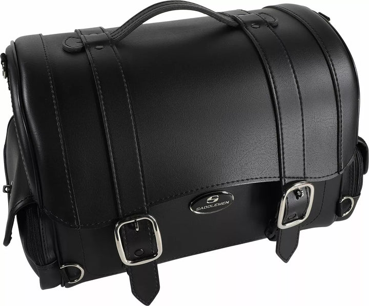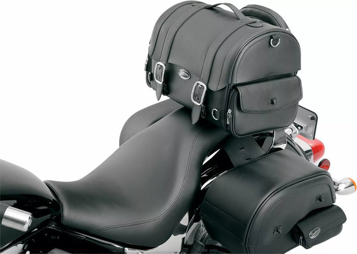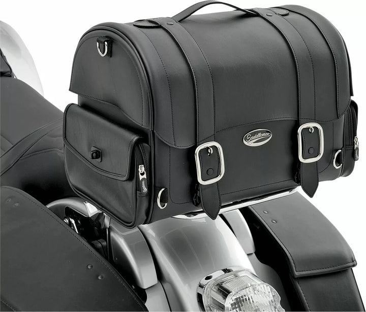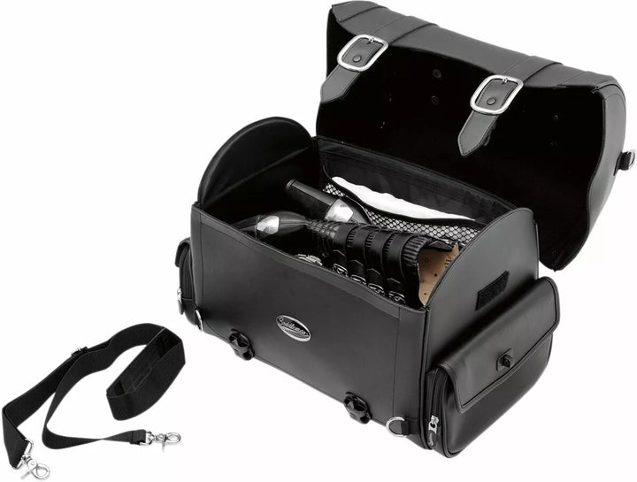 Slank-stil halepose med stropper og store forkromede spænder, låsbare, hurtige rulle spænder skjult under store kromspænder, lavet af robuste læderkornsaddlehyde ™ og plastforstærkende paneler, stiv konstruktion holder disse BAP-monteringsmuligheder tilpasset til enhver cykel; Fastgøres til sissy bar, rack eller ovenpå passagersæde, brugervenlig sissy barrem inkluderet, justerbare bungee stropper, der sælges separat; Flere ankerpunkter, inklusive fire tunge afkromede D-ring og flere stroppespalter, der er tilvejebragt til hurtig, let montering, rivet tophåndtag og aftagelig skulderrem til praktisk transport fra cyklen, hat-boks stil lang sider Protte let åbent låg giver praktisk adgang, to lynlås 16 X 12½ "H: 19" L WH POW "