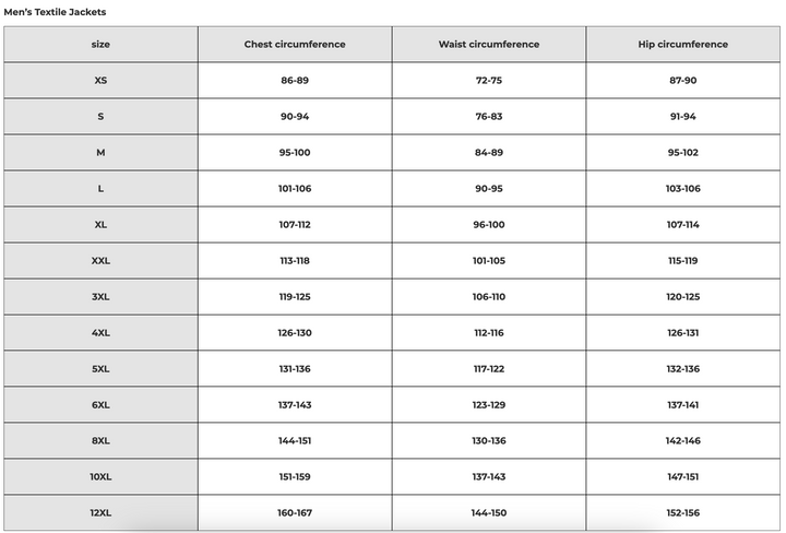 Storlekstabell för Seca Textil Mc-Jacka Aero Pro Svart med mått för bröst, midja och höfter, tillgänglig i storlekar från XS till 12XL.