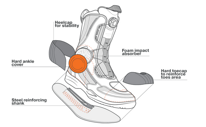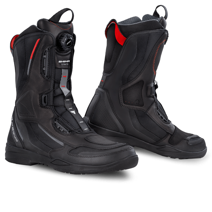 Shima Strato -sko vejer kun 702 gram, hvilket væsentligt påvirker komforten ved at køre på en motorcykel. Fodtøjet bruger en SAP ™ ankelbeskyttelse og Armorplus -støddæmper. Forstærket hæl, ankler og tæer samt et specielt kryds -forstærket sål tilvejebringer let stabilisering, når stagnerende afbalancering af motorcyklen. Ikke -lip -fri, gummieret pude vil lette skifte selv under svære vejrforhold. Forstærkning på dette sted forhindrer skoene i at blive brugt for hurtigt, hvilket reducerer risikoen for skade og øger således dens levetid.