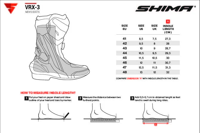 Opsummering: VRX-3 er de perfekte motorcykelstøvler til førere, der søger kombinationen af sikkerhed, komfort og stil. Med deres innovative systemer, stærke beskyttelse og høj ventilation tilbyder disse støvler alt, hvad der er nødvendigt for at håndtere både bykørsel og sporty kørsel med høj intensitet. Oplev et nyt niveau af kørselskomfort og sikkerhed med VRX-3 støvlerne.