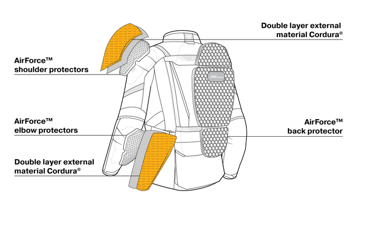 Et sæt luftigt, certificeret ryg, skulder og albue beskyttelse (LVL 2) og mange reflekterende elementer tager sig af din sikkerhed.