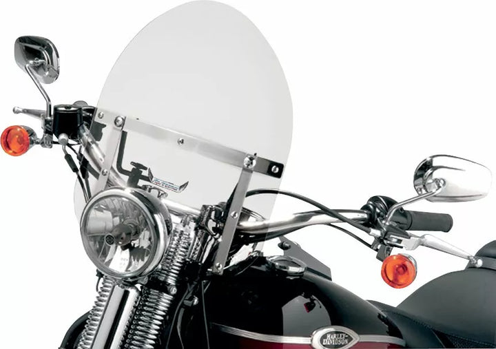 Forstående forrude i mellemstor; 1 "Hardware inkluderet, universal styreklemme, der passer til de fleste Harley Davidson-modeller ved hjælp af 1" Buckhorn eller Pullback-stil styret og en 5-3/4 "forlygte, lavet i U.S.A.