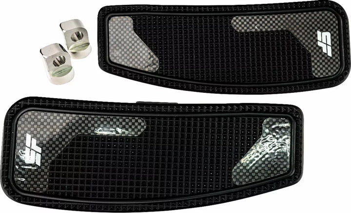 Mini gulvbrædder, der sælges parvis, er konstrueret af billet aluminium med diamantskæring, billet aluminium med rustfrit stål montering af Clevis, carbonfiberindsats dækket med TPU -filmbeskyttelse for holdbarhed og en varig finish, modeller med passagerfodpatpe -gulvpladsmonteringer.