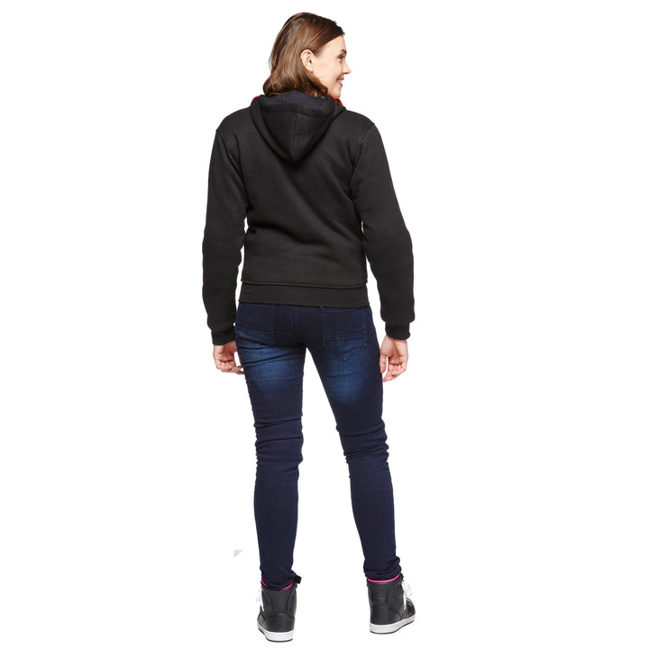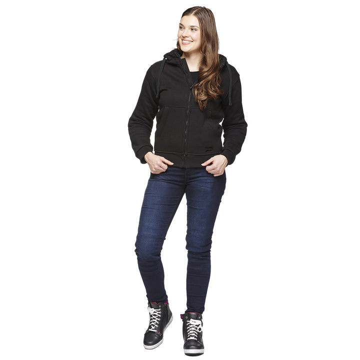 Sweep Kevlar MC-Hoodie til damer er en behagelig og stilren sort motorcykelhoodie, perfekt til varme dage. Fremstillet af tyk og blød bomuld, forstærket med Aramidfibre for ekstra slidstyrke og sikkerhed. Hoodien har aftagelige CE EN1621-1-godkendte beskyttelser i skuldre og albuer, som effektivt absorberer stød ved en eventuel ulykke.