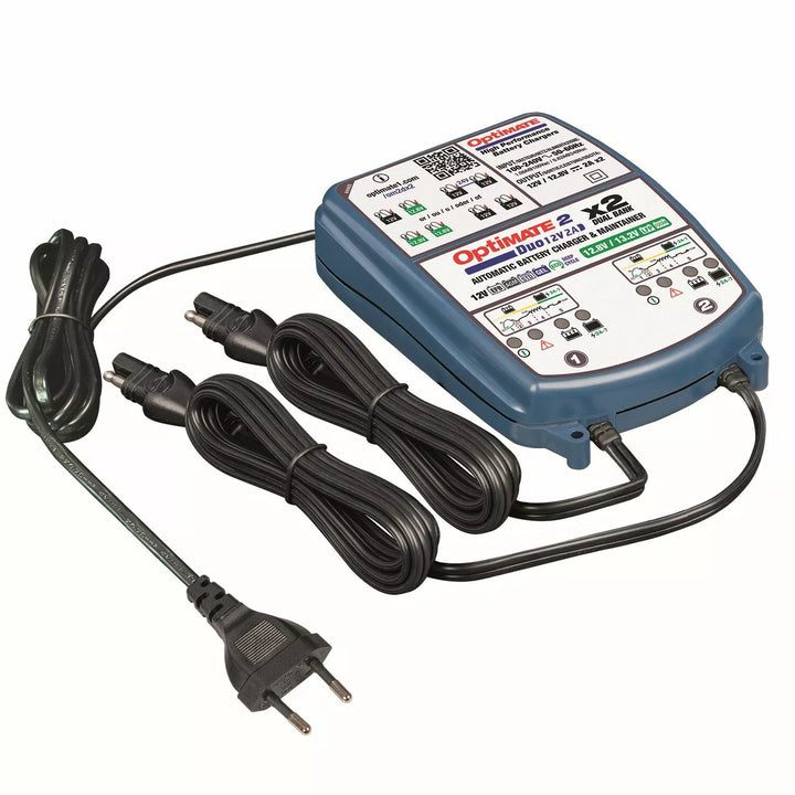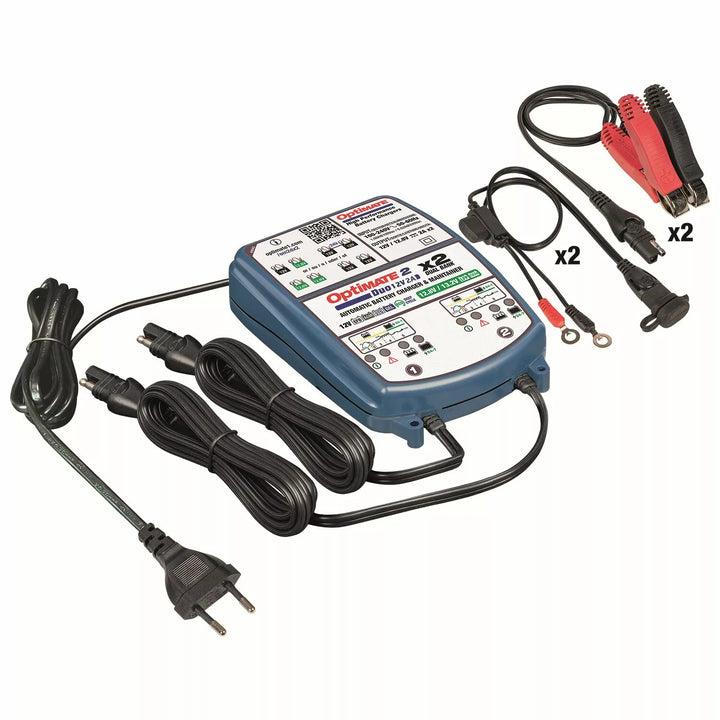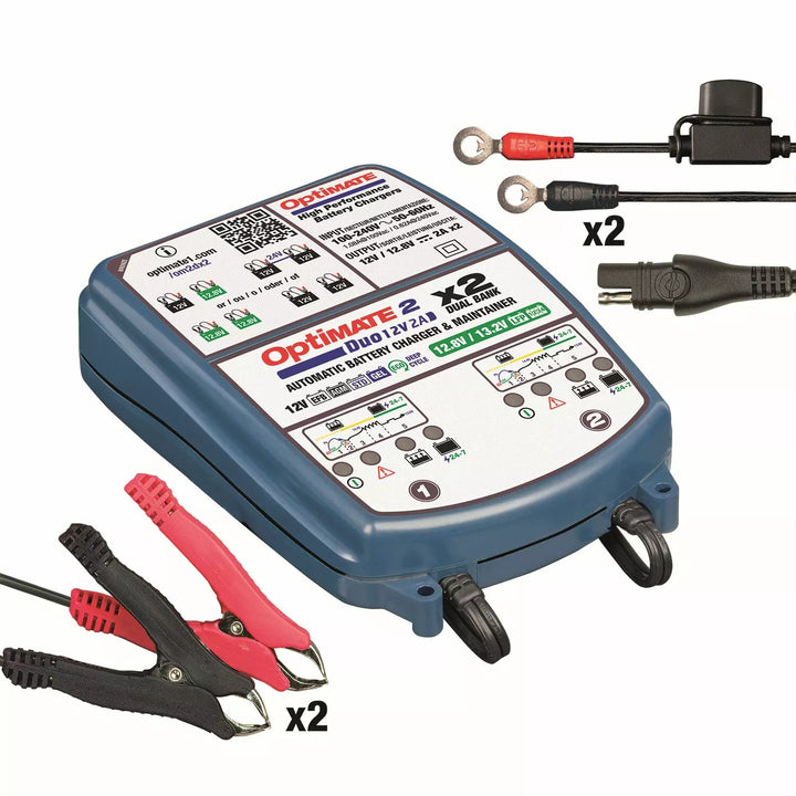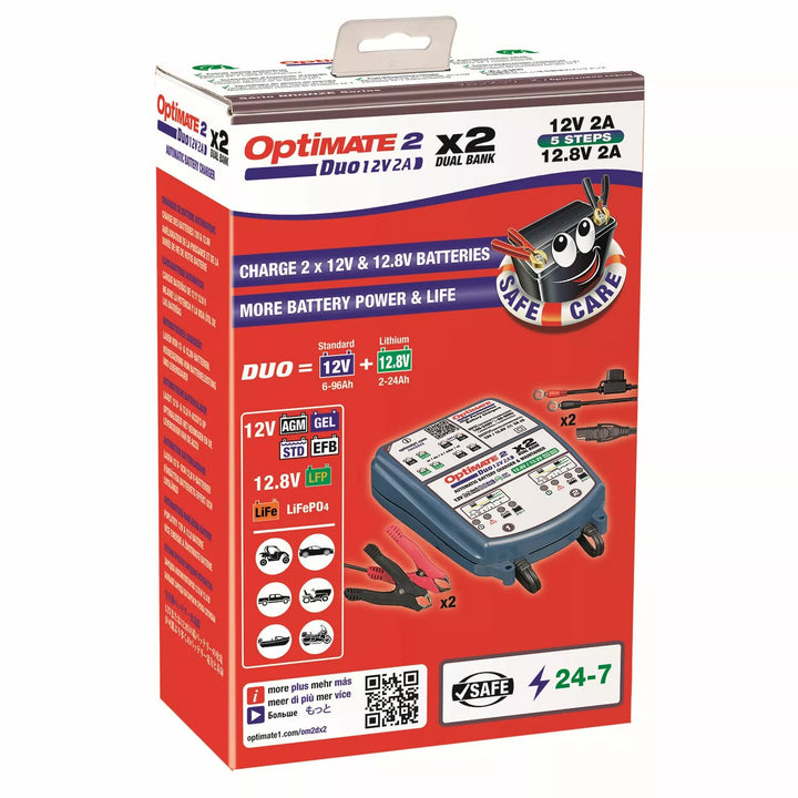 Opticate 2 Duo X 2 Bank Bronze Series: 5-trins 12V / 12.8V 2A forseglet batteri vedligeholder x2., Den kraftfulde 'No Brain' 2-Bank Battery Mainainer til Hi-Technology Battery i nogen af dine køretøjer. Garantier sundt lithium- eller bly-syrebatteri!, Ideel til 2x 12V bly-syre & 12.8V / 13.2V lithium LFP (LIFEPO4) batterier., Uafhængigt oplad, test og vedligehold 2 x 12V blylag (STD, gel) batterier. Batterier er altid klar til at udføre., Leverer 2 ampere opladningsstrøm, der er anbefalet til vedligeholdelse af større batterier., Afgifter og leverer langvarig vedligeholdelse. Opret forbindelse til batteriet og Optime 2 Duo Dual Bank gør resten, ingen tilsyn krævet!, Duo: tilpasses automatisk til PB- eller LFP -batteri., Sikker at forlade tilsluttet. Fuld elektronisk beskyttelse., 24/7: Vedligeholder batteri ved fuld opladning og godt helbred., Lav volt start på 4v., Advarselbatteri er detekteret., Grøn teknologi: Energibesparende teknologi. Standby-strøm mindre end 0,5 W og effektiv 24-7 batterileduktion., IP54: Vejrbestandig. Bedømt til brug ned til -40 ° C / -40 ° F.