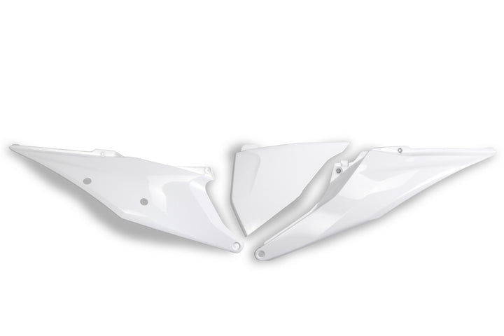 UFO-plast er kendt for deres kvalitet og deres modstand mod off-road brug. De er designet som OEM -plastik og er lette at montere. De bruges af dagens MXGP -tophold og danner verdensmestre. OEM -typemade fra UV, Choc og Torsion Resistent Injicered Plastic Color: White