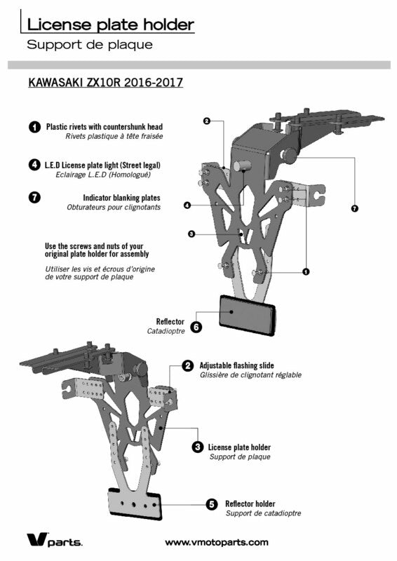 V Parts nummerpladeholder er fremstillet i Frankrig. Inconspicouse og perfekt færdige, de er specifikt udviklet til den vedhæftede cykelapplikationsliste. 2 mm tynd, men robust stål nummerpladeholder sort epoxy -maleri CNC Fremstillet - Laserskæring: Præcise finishhul For at fikse nummerpladen, indikatorer og nummerpladebelysning lavet i Frankrig Indhold: Street Legal Licesplate Lighting, certificeret mere info: Optimeret og diskret kabelpassag Fast & let montering Justerbare indikatorer Brackets EU Homologation: CE -homologeret materiale: stål
