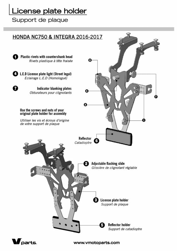 V PARTS nummerpladeholder er fremstillet i Frankrig. Diskret og perfekt færdiggjort, de er specifikt udviklet til den vedhæftede cykelapplikationsliste. 2mm tynd men robust stål nummerpladeholder Sort epoxy maling CNC fremstillet – laser skåret: præcis finish Huller til fastgørelse af nummerplade, indikatorer og nummerpladebelysning Fremstillet i Frankrig Indhold: Gadelegal nummerpladebelysning, EU certificeret Justerbar reflektorplade Reflektor, EU certificeret Mere info: Optimeret og diskret kabelgennemgang Hurtig & nem montering Justerbare indikatorbeslag Passer til EU plader Indikatorlys afstand: 170 til 220mm Farve: Sort Homologation: CE homologeret Materiale: Stål
