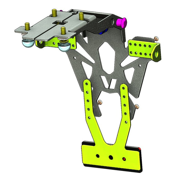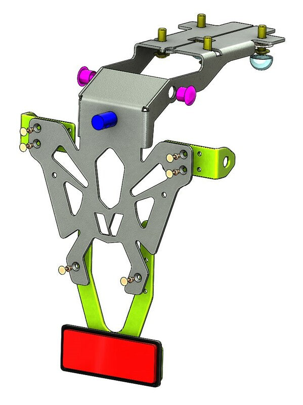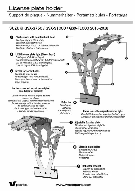 V PARTS nummerplader, diskrete og perfekt udførte, er specielt udviklet til hver cykelapplikation. Tynd og robust stål nummerpladeholderSort epoxymalingCNC fremstillet – laser skåret: præcis finishHuller til at fastgøre nummerplade, blinklys og nummerpladebelysningFremstillet i Frankrig Indhold: Lovlig nummerpladebelysningJusterbar reflektorpladeReflektor Farve: Sort Materiale: Stål