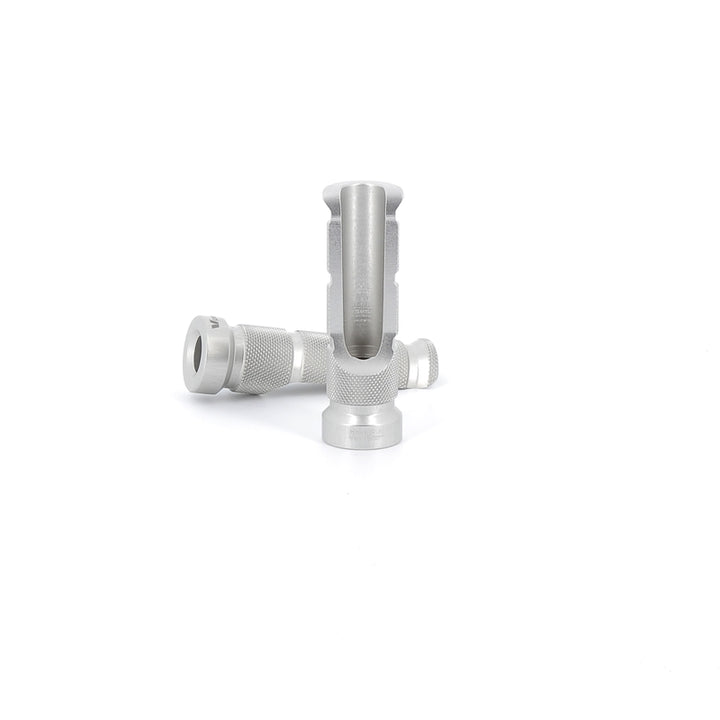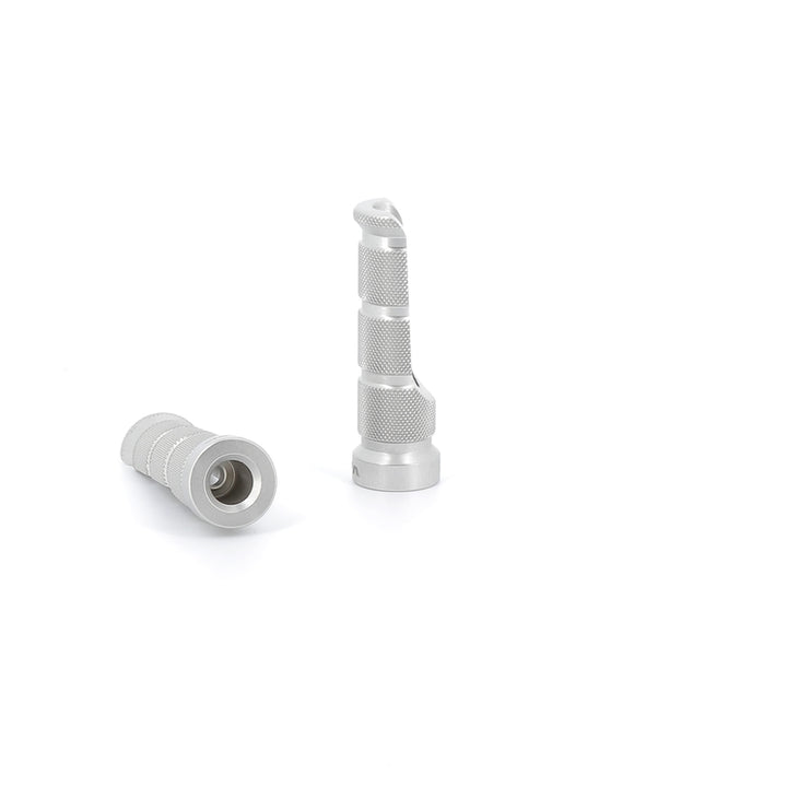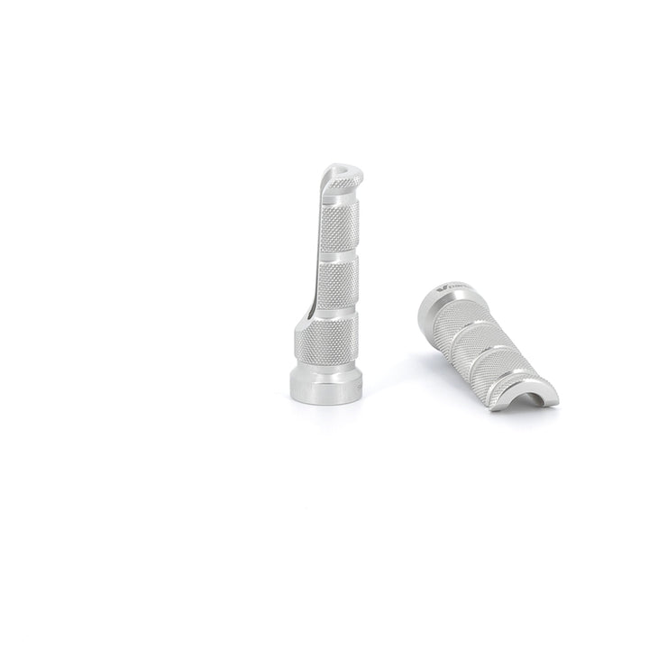 Aluminium fodpinde lavet af anodiseret CNC-bearbejdet aluminium Sælges i parUden forbindelse Alle modeller er tilgængelige i: Rød GrønSortAluminiumGuldTitaniumOrangeBlå Farve: Aluminium