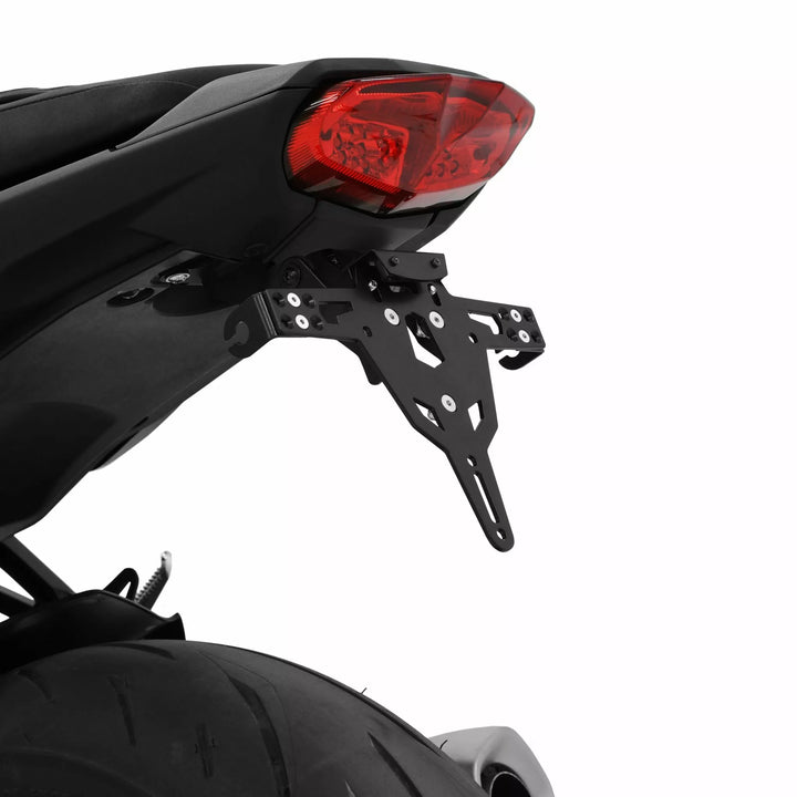 Licenspladeholderen er ekstremt holdbar og vejrbestandig., Sort pulverlakeret. , Nummerpladeholderen kan bruges til enhver form for nummerplade (175 mm bredde)., Ingen ændring af fairing kræves., Stepløs justering af rake -vinkel., Indikatorstøtte justerbar i 3 positioner. Plade., Specialindikatorlysmonteringer (solgt separat), der kræves til lagerindikatorlys., Kit inkluderer: 1 nummerpladeholder inkl. Montering Kit., LED -nummerplade Lys "E godkendt" inkl. Support., Baglys med støtte.