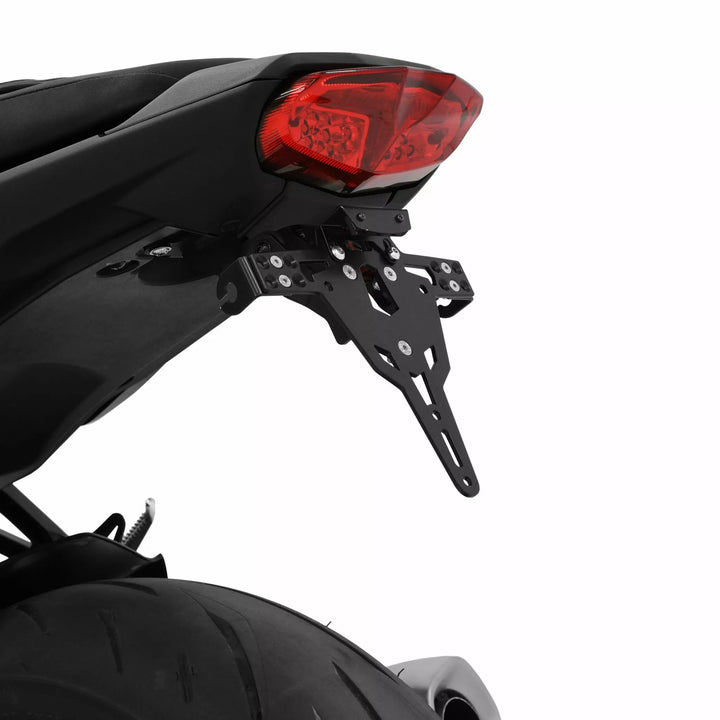 Licenspladeholderen er ekstremt holdbar og vejrbestandig., Sort pulverlakeret. , Nummerpladeholderen kan bruges til enhver form for nummerplade (175 mm bredde)., Ingen ændring af fairing kræves., Stepløs justering af rake -vinkel., Indikatorstøtte justerbar i 3 positioner. Plade., Specialindikatorlysmonteringer (solgt separat), der kræves til lagerindikatorlys., Kit inkluderer: 1 nummerpladeholder inkl. Montering Kit., LED -nummerplade Lys "E godkendt" inkl. Support., Baglys med støtte.