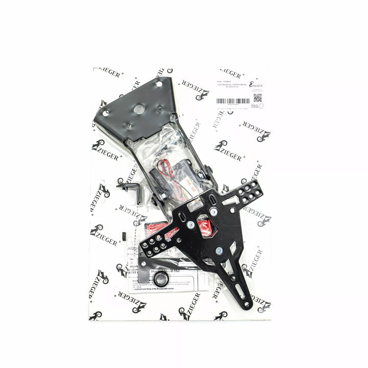 Licenspladeholderen er ekstremt holdbar og vejrbestandig., Sort pulverlakeret. , Nummerpladeholderen kan bruges til enhver form for nummerplade (175 mm bredde)., Ingen ændring af fairing kræves., Stepløs justering af rake -vinkel., Indikatorstøtte justerbar i 3 positioner. Plade., Specialindikatorlysmonteringer (solgt separat), der kræves til lagerindikatorlys., Kit inkluderer: 1 nummerpladeholder inkl. Montering Kit., LED nummerplade Lys "E Approsved" inkl. Support., Baglys med støtte. Af: Tyskland, Slovenien, Kroatien og UK.