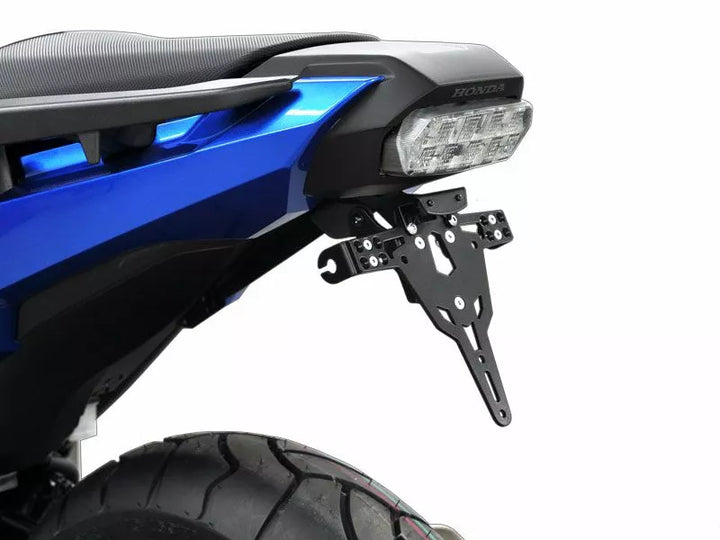 Licenspladeholderen er ekstremt holdbar og vejrbestandig., Sort pulverlakeret. , Nummerpladeholderen kan bruges til enhver form for nummerplade (175 mm bredde)., Ingen ændring af fairing kræves., Stepløs justering af rake -vinkel., Indikatorstøtte justerbar i 3 positioner. Plade., Specialindikatorlysmonteringer (solgt separat), der kræves til lagerindikatorlys., Kit inkluderer: 1 nummerpladeholder inkl. Montering Kit., LED nummerplade Lys "E Approsved" inkl. Support., Baglys med støtte. Af: Tyskland, Slovenien, Kroatien og UK.