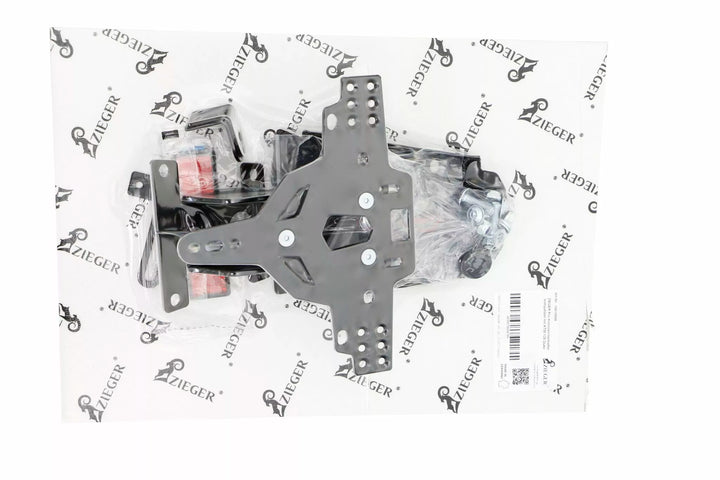 Licenspladeholderen er ekstremt holdbar og vejrbestandig., Sort pulverlakeret. , Nummerpladeholderen kan bruges til enhver form for nummerplade (175 mm bredde)., Ingen ændring af fairing kræves., Stepløs justering af rake -vinkel., Indikatorstøtte justerbar i 3 positioner. Plade., Specialindikatorlysmonteringer (solgt separat), der kræves til lagerindikatorlys., Kit inkluderer: 1 nummerpladeholder inkl. Montering Kit., LED -nummerplade Lys "E godkendt" inkl. Støtte. Af: Schweiz, Polen og Irland.